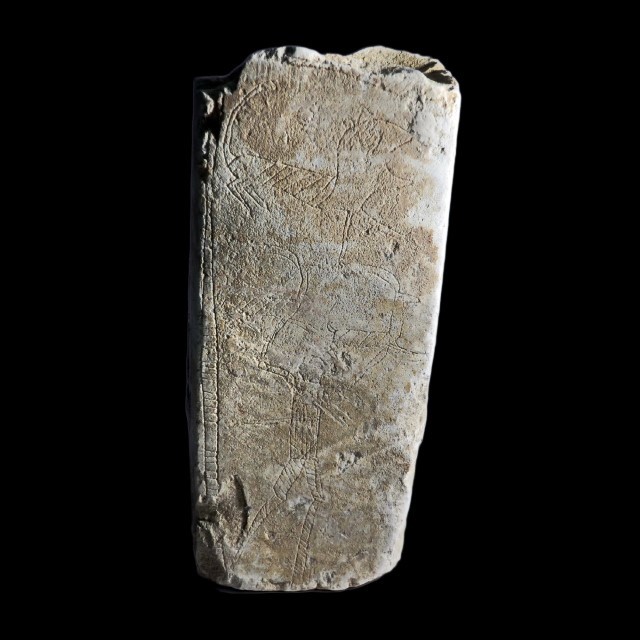 מזבח אבן, מעוטר בגרפיטי (אדם מרים ידיו, מעליו 2 איילות, מעליהן אריה), התקופה הפרסית