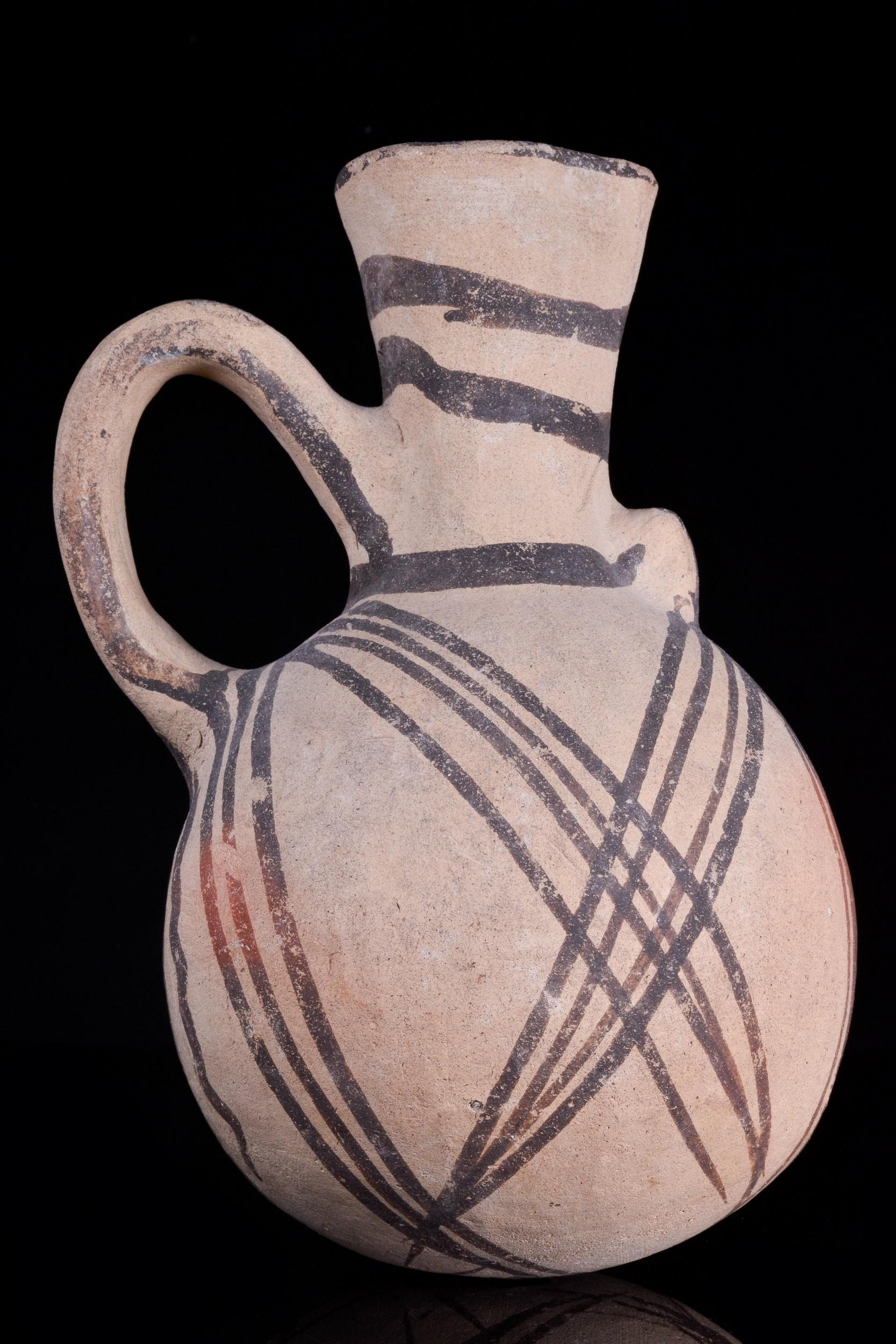 פך מעוטר בקווים בגוון שחור, בסגנון כלים מעוטרים בי-כרומו אך בגוון אחד. במקור יובא מקפריסין. תקופת הברונזה המאוחרת.