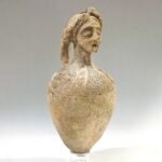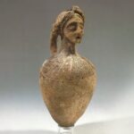 פכית, עם ראש אשה בתסרוקת מסוגננת. הפכית (Juglet) מעוטרת בדיקור בסגנון “תל אל יהודיה”. כלי (Vessel) אנתרופומורפי. יריחו. תקופת הברונזה (Bronze) התיכונה 2 (המוזיאון הארכיאולוגי רבת עמון)
