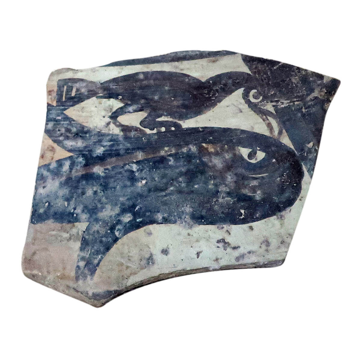 שבר קדרה מעוטרת בדג (לוויתן?) וציפור בסגנון דו-גוני (שחור-אדום, ביכרומו). יבוא קדום מקפריסין. תל אל עג'ול. תקופת הברונזה המאוחרת
