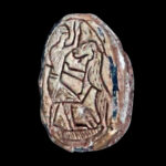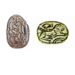 2 חרפושיות מתל יריחו: משמאל – אדם נלחם באריה ומימין – אריה רובץ. תקופת הברונזה (Bronze) התיכונה 2ב