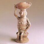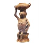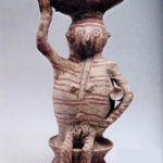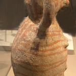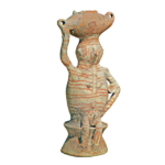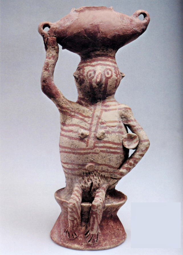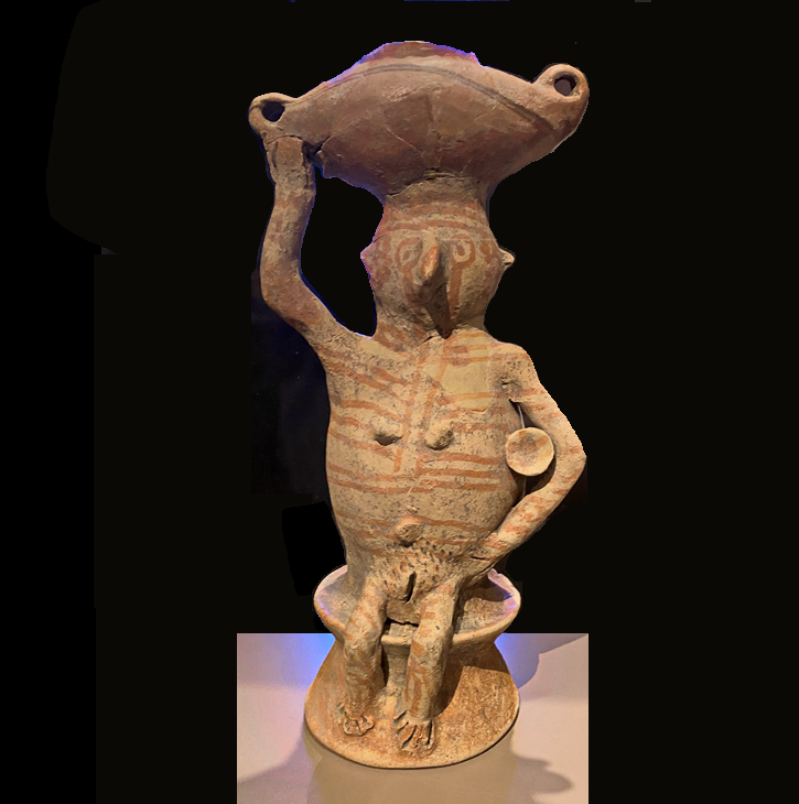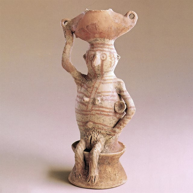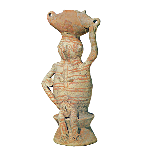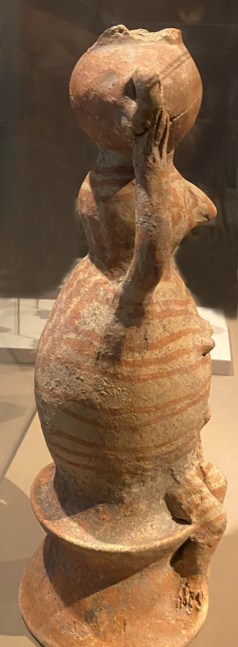 A cultic anthropomorphic vessel, in the shape of a seated woman balancing a churn on her head and holding a vessel in the crook of her left arm. Painted with red lines. Gilat (the northern Negev near Ofakim). The Chalcolithic period
