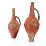 פכים גבוהים (2), ממורקים אדום, עם צוואר צר, ברונזה קדומה ב בתמונה השנייה: 2 פכים מקברי המלכים הראשונים של מצרים, מאבידוס שבדרום מצרים.