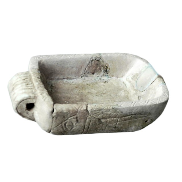 Rectangular stone container for cosmetics, illustrated with an engraved figure of a Canaanite warrior.