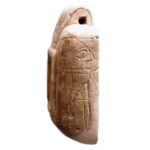 מיכל אבן מלבני לתמרוקים (קוסמטיקה), מאויר בדמות חרוטה של לוחם כנעני
